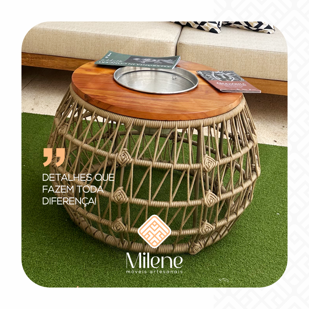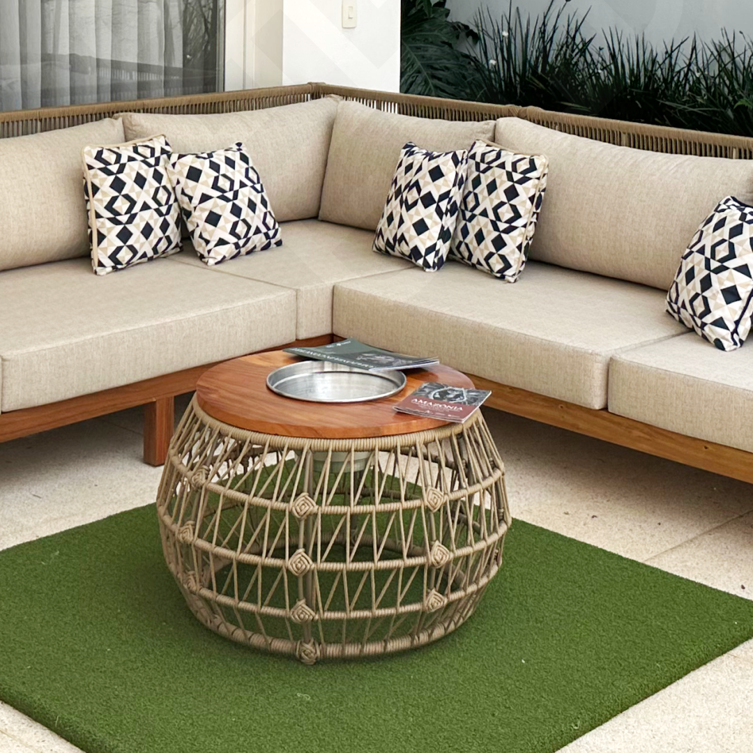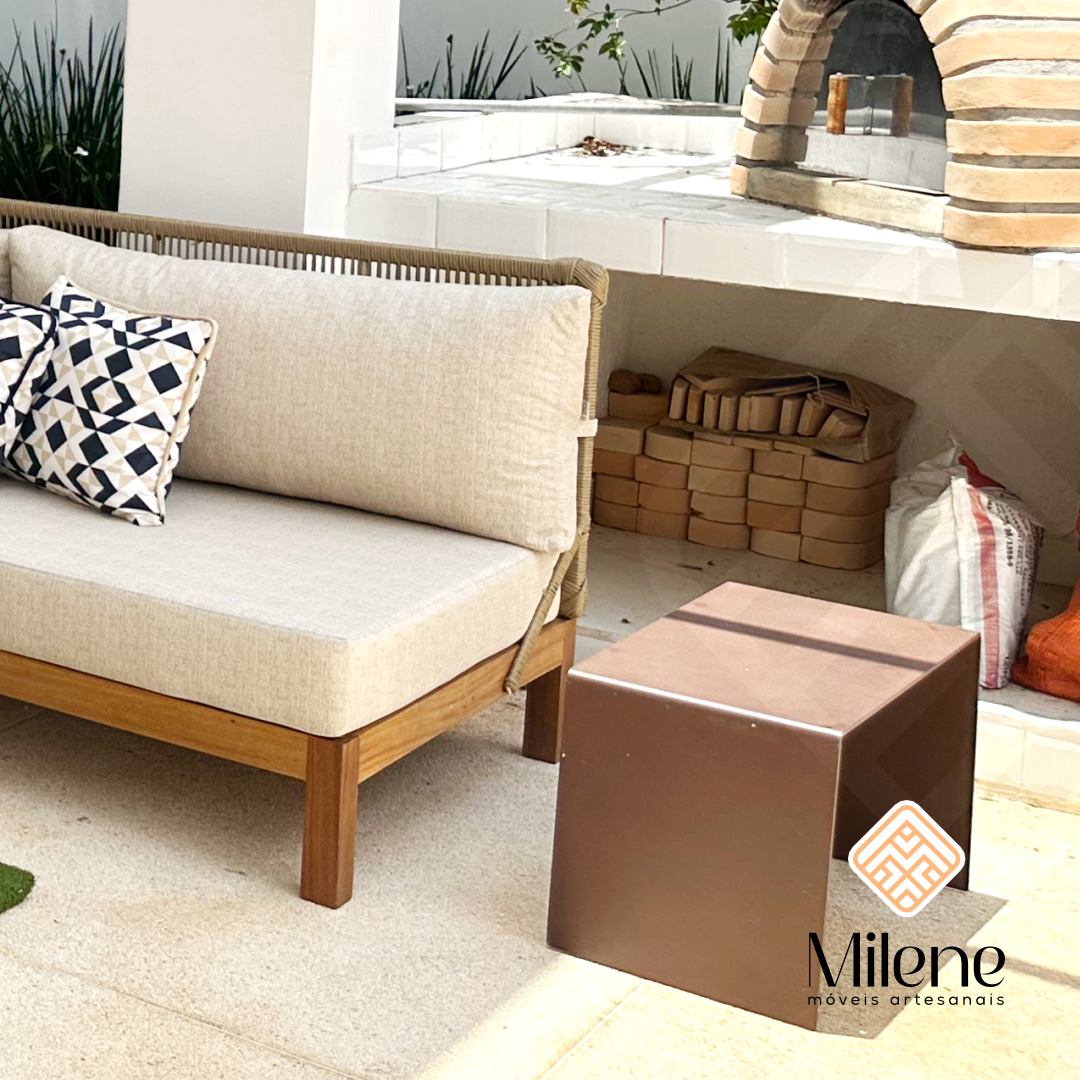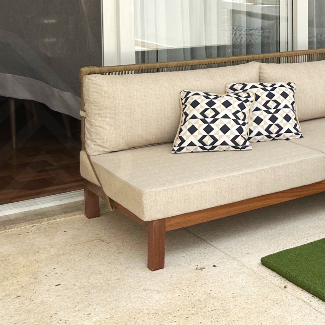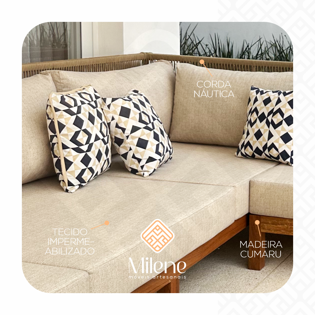 Sofá artesanal revestido com corda náutica de alta qualidade, proporcionando durabilidade e estilo. Acompanha tapeçaria em tecido impermeável, ideal para áreas internas e externas, garantindo conforto e resistência em qualquer ambiente.